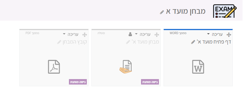 את קובץ המבחן יש לעלות למודל לפחות כשבוע לפני מועד המבחן ועליו להיות עם הגבלת גישה כך שהסטודנטים לא יוכלו להחשף אליו עד למועד המבחן.